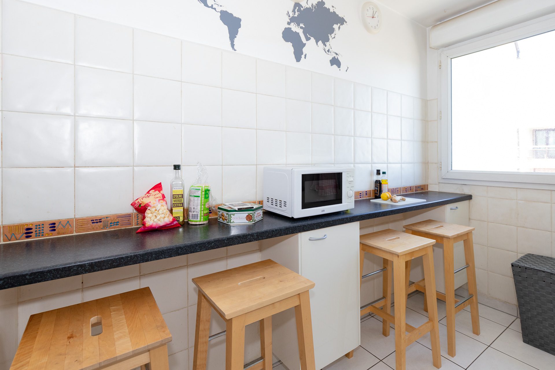 La colocation se trouve au 5 ème étage, vous y avez accès par un escalier ou un ascenseur. De plus, il dispose d’une longue entrée avec plusieurs espaces de rangements donnant sur la cuisine  de type « bar américain » par sa décoration, le fameux séjour rouge et noir avec table à manger ainsi que les chambres.
